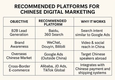 Ad Formats – Baidu offers search, display, and native feed ads. For B2B, search intent campaigns often deliver the best ROI.